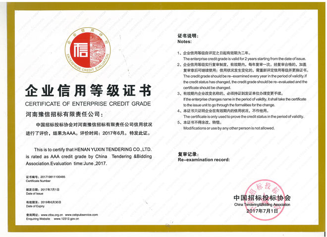 中國(guó)招投標(biāo)協(xié)會(huì)3A企業(yè)信用等級(jí)證書