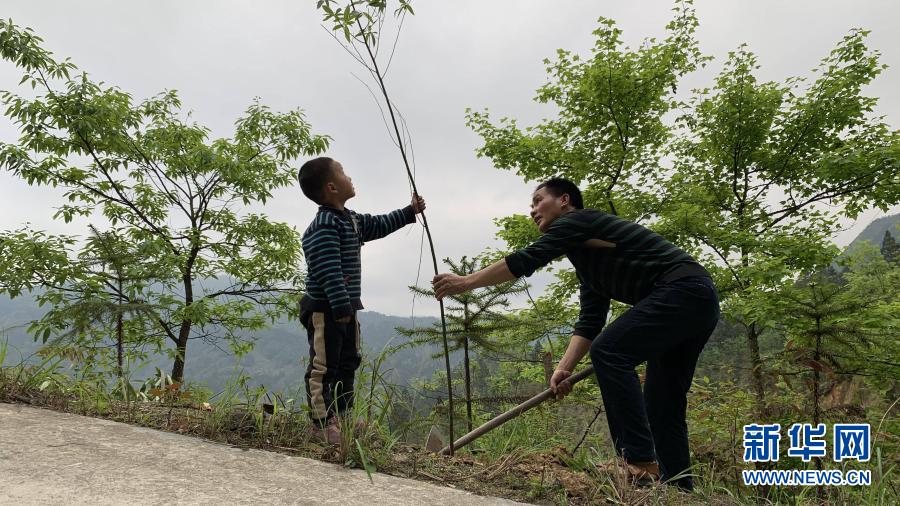 吳新仁(右)帶著兒子吳良友在烏英苗寨的公路邊種植景觀樹(2019年4月12日攝)。新華社記者 黃孝邦 攝