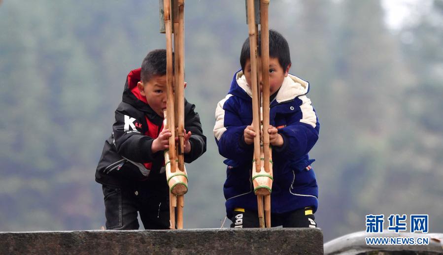 在烏英苗寨,吳良友(左)和小伙伴在吹蘆笙(2019年12月28日攝)。新華社記者 黃孝邦 攝