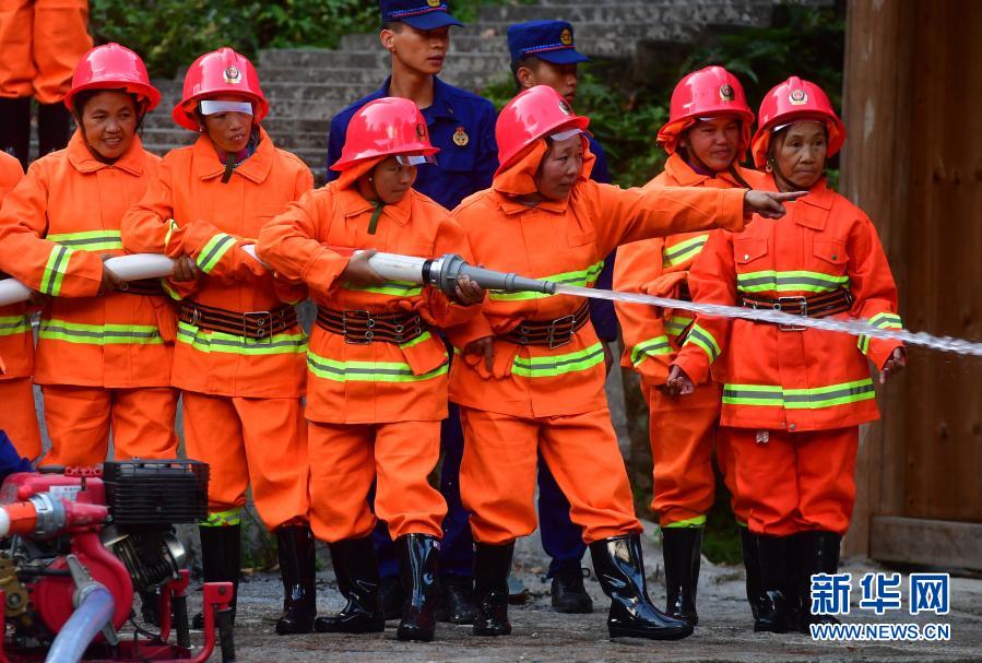 烏英苗寨女子志愿消防隊隊員梁足英(右三)和隊友們在融水縣消防救援大隊消防隊員的指導下進行消防演練(11月19日攝)。新華社記者 黃孝邦 攝