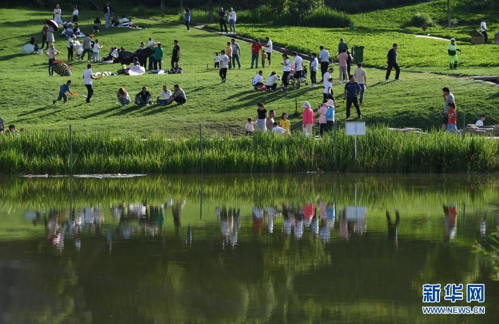 2020年8月19日,游人在位于延安市南泥灣景區(qū)的濕地公園游玩賞景。新華社發(fā)(祁小軍 攝)