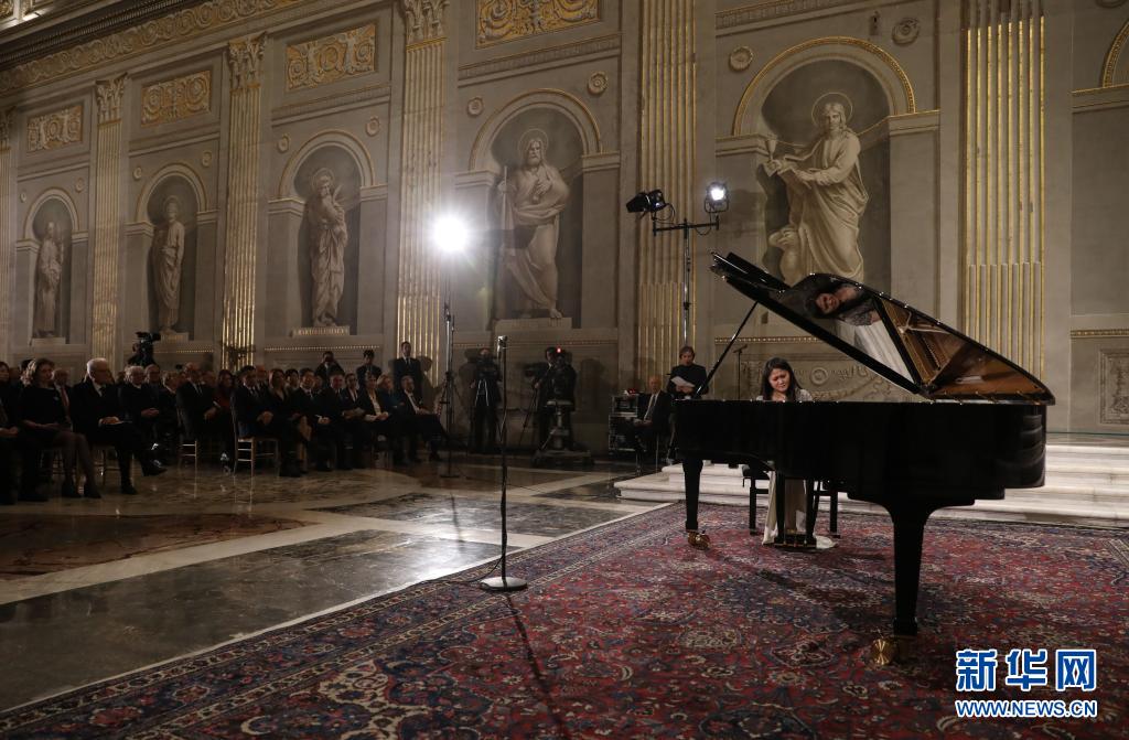 2020年2月13日,在意大利羅馬總統(tǒng)府奎里納萊宮,旅意華人鋼琴家居覲在音樂(lè)會(huì)現(xiàn)場(chǎng)演奏。當(dāng)日,由意大利總統(tǒng)馬塔雷拉提議,在2020年中意文化旅游年計(jì)劃外加演的一場(chǎng)鋼琴獨(dú)奏音樂(lè)會(huì)在意大利總統(tǒng)府舉行,向抗擊新冠肺炎疫情的中國(guó)人民傳達(dá)友誼和支持。新華社記者 程婷婷 攝