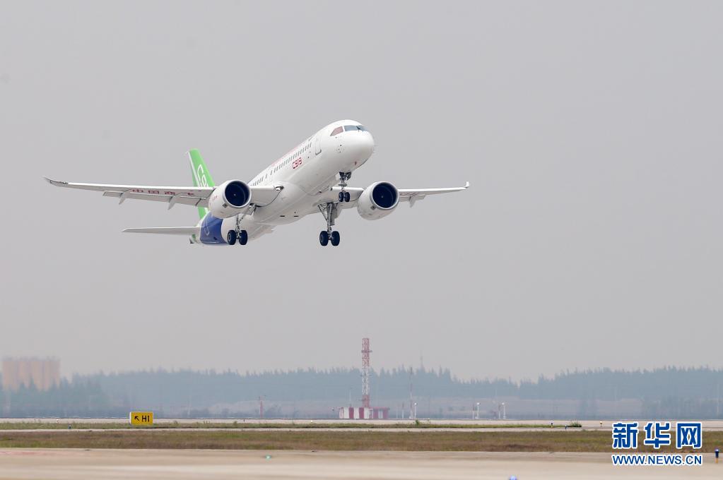 2017年5月5日,國產(chǎn)大型客機(jī)C919在上海浦東國際機(jī)場首飛成功。新華社記者 丁汀 攝
