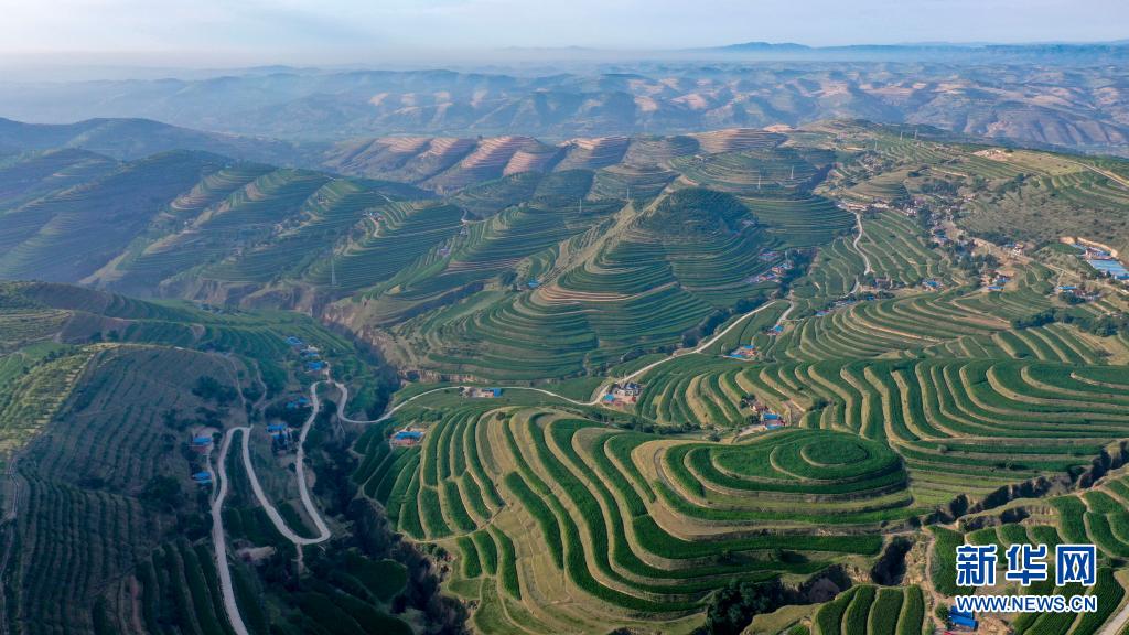 這是7月14日在寧夏固原市彭陽縣拍攝的青云灣旱作梯田公園(無人機(jī)照片)。新華社記者 馮開華 攝
