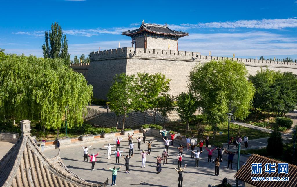 6月18日,寧夏鹽池縣居民在城墻腳下跳廣場舞(無人機(jī)照片)。新華社記者 馮開華 攝
