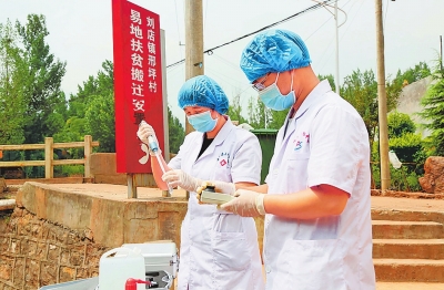 ?? 7月28日,汝陽(yáng)縣疾控中心工作人員對(duì)劉店鎮(zhèn)邢坪村群眾飲用水進(jìn)行抽樣化驗(yàn)。 康紅軍 攝