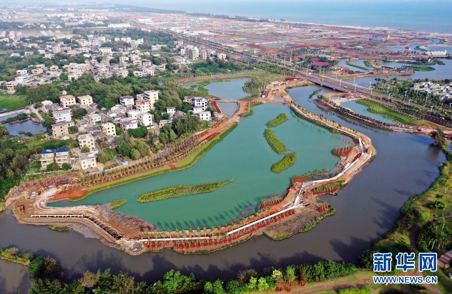 這是海口市江東新區(qū)芙蓉河綜合治理工程(11月6日攝,無人機照片)。新華社記者 郭程 攝