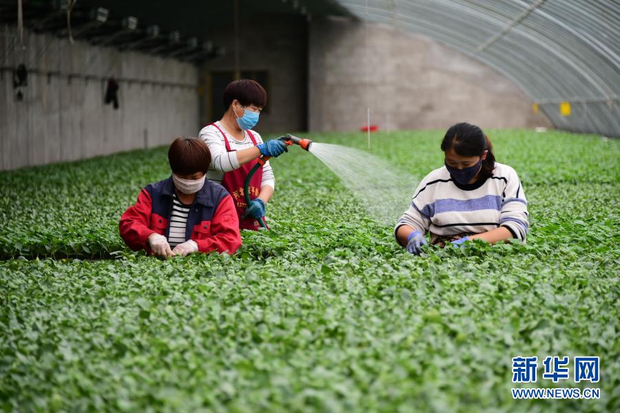 河北曲周縣一家育苗產(chǎn)業(yè)基地的工人在育苗溫棚內工作(5月4日攝)。曲周縣積極拓寬產(chǎn)業(yè)扶貧渠道,發(fā)揮當?shù)禺a(chǎn)業(yè)優(yōu)勢,統(tǒng)籌協(xié)調貧困戶利用扶貧資金入股現(xiàn)代設施農(nóng)業(yè)基地,帶動群眾脫貧增收。新華社記者 朱旭東 攝