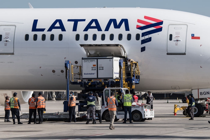 當?shù)貢r間1月28日上午,首批近200萬劑由中國科興公司生產(chǎn)的新冠疫苗運抵智利首都圣地亞哥。新華社發(fā)(豪爾赫·比列加斯攝)