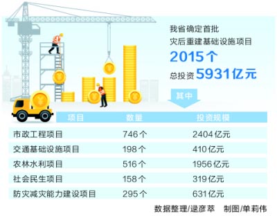 8月23日,記者從省發(fā)展改革委獲悉,我省確定首批災(zāi)后重建基礎(chǔ)設(shè)施項(xiàng)目2015個(gè),總投資5931億元,涉及市政工程項(xiàng)目、交通基礎(chǔ)設(shè)施項(xiàng)目、農(nóng)林水利項(xiàng)目、社會(huì)民生項(xiàng)目、防災(zāi)減災(zāi)能力建設(shè)項(xiàng)目等多個(gè)領(lǐng)域。
