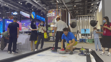 在奧地利展廳,一個(gè)小型冰壺場(chǎng)吸引眾人關(guān)注,不時(shí)有參觀(guān)者體驗(yàn)。