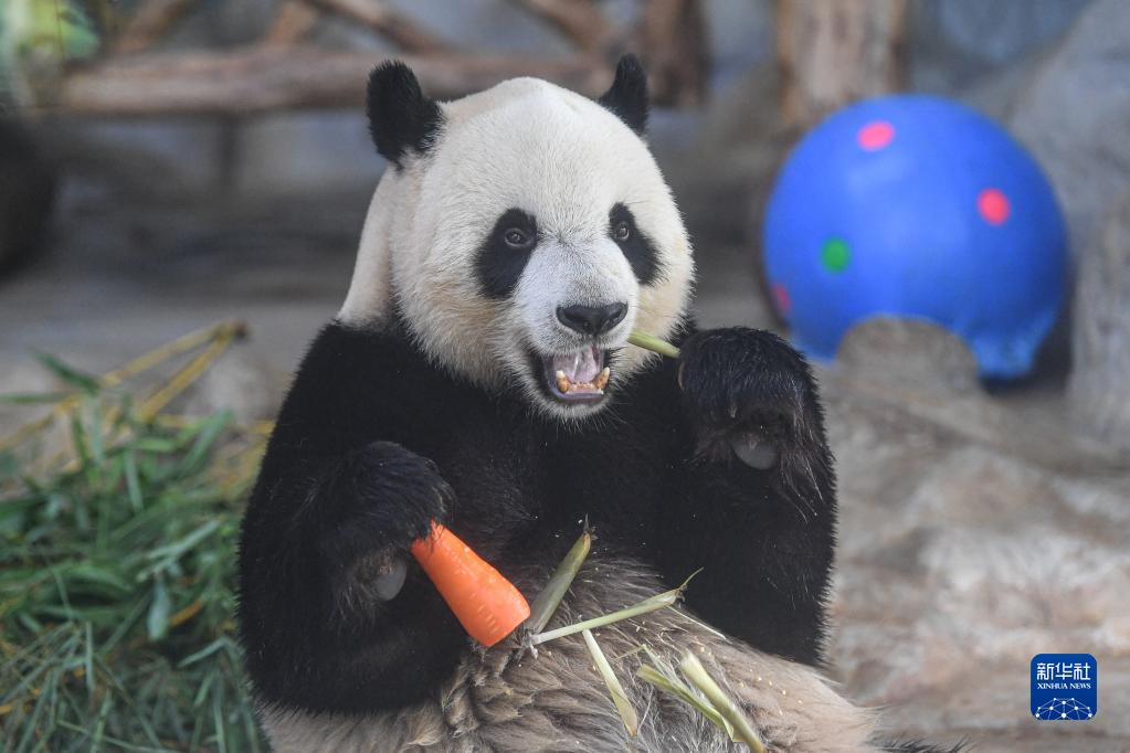 在位于海口的海南熱帶野生動(dòng)植物園,大熊貓“舜舜”在享用美食(6月14日攝)。新華社記者 蒲曉旭 攝