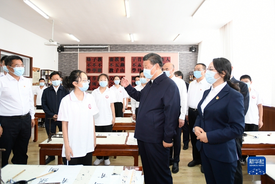 9月13日至14日,中共中央總書記、國家主席、中央軍委主席習(xí)近平在陜西省榆林市考察。這是14日上午,習(xí)近平在綏德實(shí)驗(yàn)中學(xué)考察時(shí),同正在練習(xí)書法的學(xué)生親切交流。新華社記者 李學(xué)仁 攝