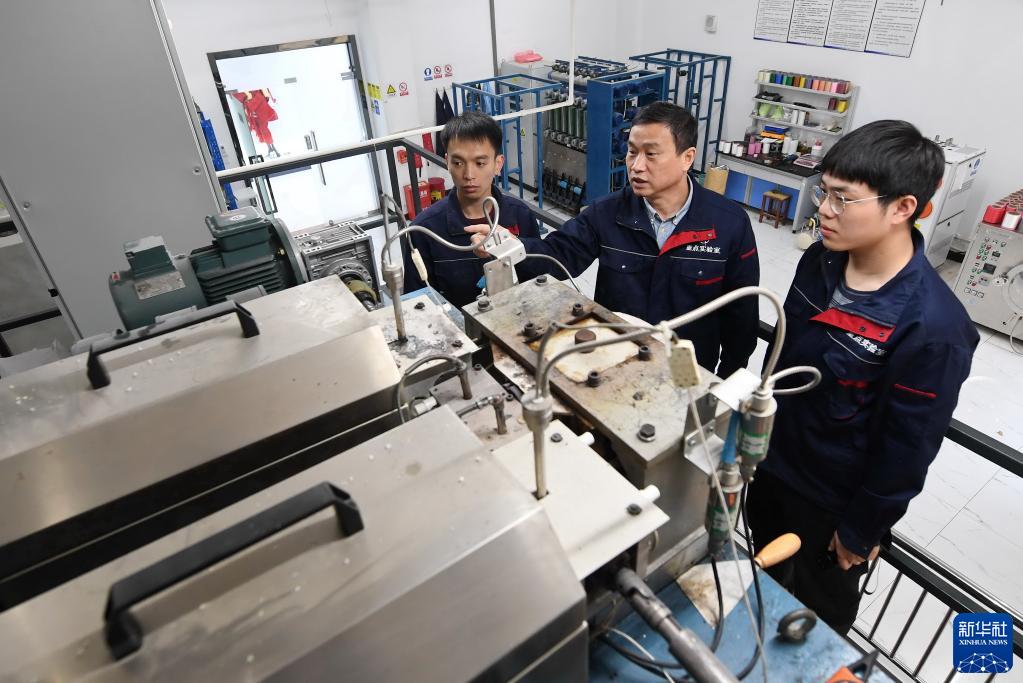 福建閩江學(xué)院服裝與藝術(shù)工程學(xué)院教授李永貴(中)在“福建省新型功能性紡織纖維及材料重點(diǎn)實(shí)驗(yàn)室”教學(xué)生做紡絲實(shí)驗(yàn)(3月22日攝)。新華社記者 林善傳 攝