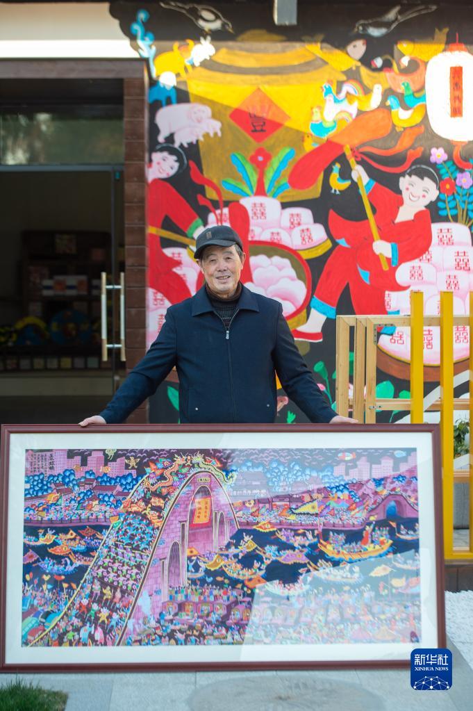 浙江省嘉興市秀洲區(qū)油車港鎮(zhèn)勝豐村村民張金泉與自己的畫作《國泰民安》合影(2020年12月15日攝)。新華社記者 江漢 攝