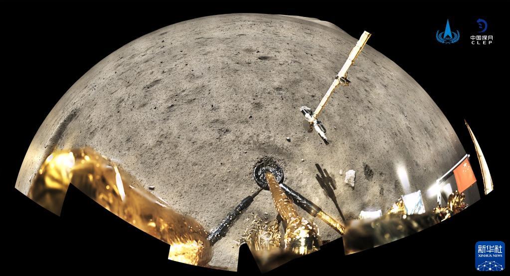 2020年12月4日,國家航天局公布了探月工程嫦娥五號探測器在月球表面國旗展示的照片。嫦娥五號著陸器和上升器組合體全景相機(jī)環(huán)拍成像,五星紅旗在月面成功展開,此外圖像上方可見已完成表取采樣的機(jī)械臂及采樣器。新華社發(fā)(國家航天局供圖)