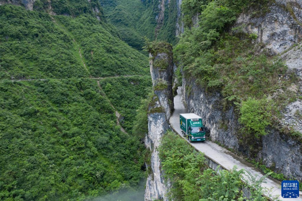 郵車行進(jìn)在通往四川省漢源縣永利鄉(xiāng)古路村的山路上(6月23日攝,無人機(jī)照片)。新華社記者 江宏景 攝