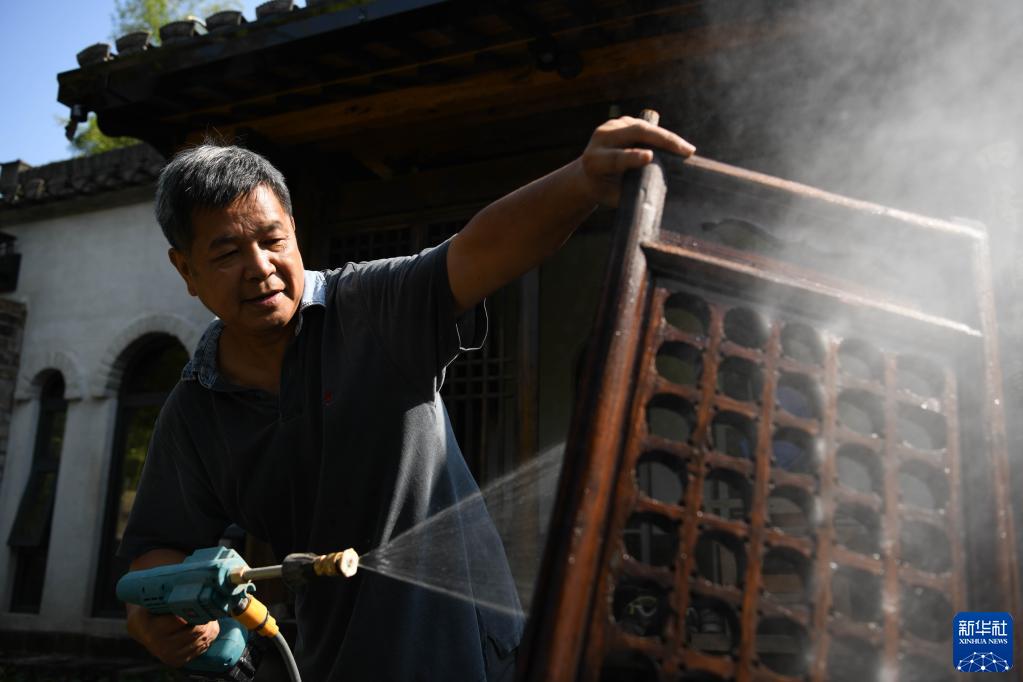 9月16日,在安徽省黃山市徽州區(qū)巖寺鎮(zhèn)石際村,張真鋼清洗收集來的舊門窗。新華社記者 張端 攝