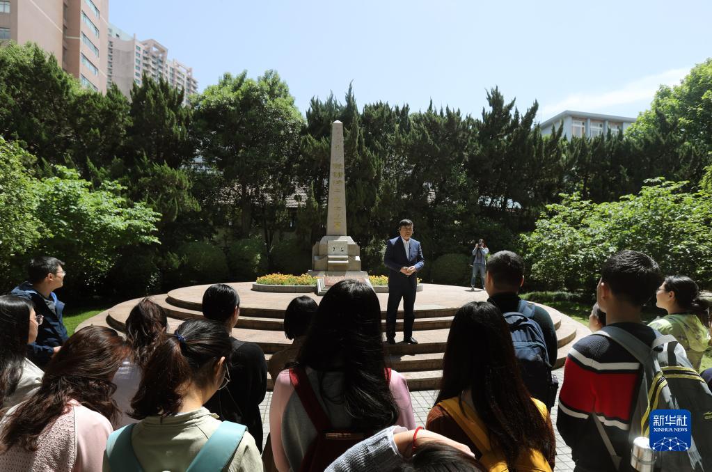 在上海交通大學校園里的史霄雯、穆漢祥烈士墓前,劉統(tǒng)教授在講述兩位烈士犧牲的歷史經過(2019年5月7日攝)。新華社記者劉穎攝
