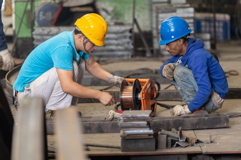 2019年11月7日,在老撾瑯勃拉邦,中國技術(shù)人員(左)在鋼筋加工廠教老撾工人檢修設(shè)備。