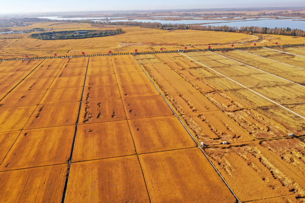 在吉林省吉林市永吉縣萬昌鎮(zhèn),農(nóng)民駕駛農(nóng)機收割水稻(2021年10月12日攝,無人機照片)。新華社記者 張楠 攝