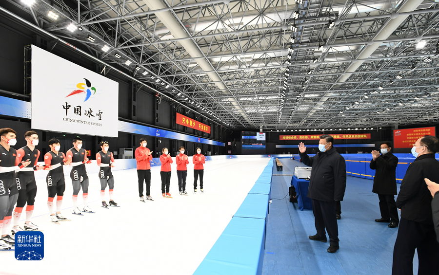 1月4日,中共中央總書記、國家主席、中央軍委主席習近平在北京考察2022年冬奧會、冬殘奧會籌辦備賽工作。這是4日下午,習近平在二七廠冰雪項目訓練基地速滑館,向參訓運動員、教練員表示慰問。新華社記者 謝環(huán)馳 攝
