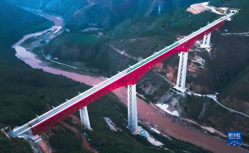 中老鐵路首發(fā)列車駛過(guò)中國(guó)云南省元江哈尼族彝族傣族自治縣境內(nèi)的元江雙線特大橋(2021年12月3日攝,無(wú)人機(jī)照片)。新華社記者 王冠森 攝