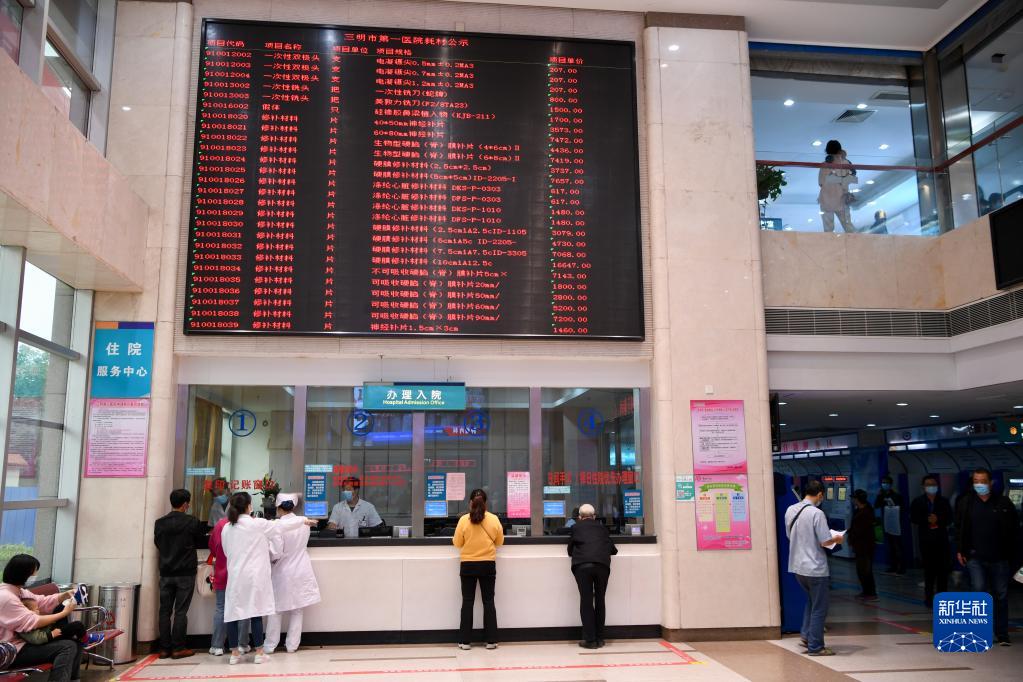 福建省三明市第一醫(yī)院的醫(yī)保辦工作人員(右)向前來咨詢藥品報銷問題的居民講解相關(guān)政策(2020年11月18日攝)。新華社記者 姜克紅 攝