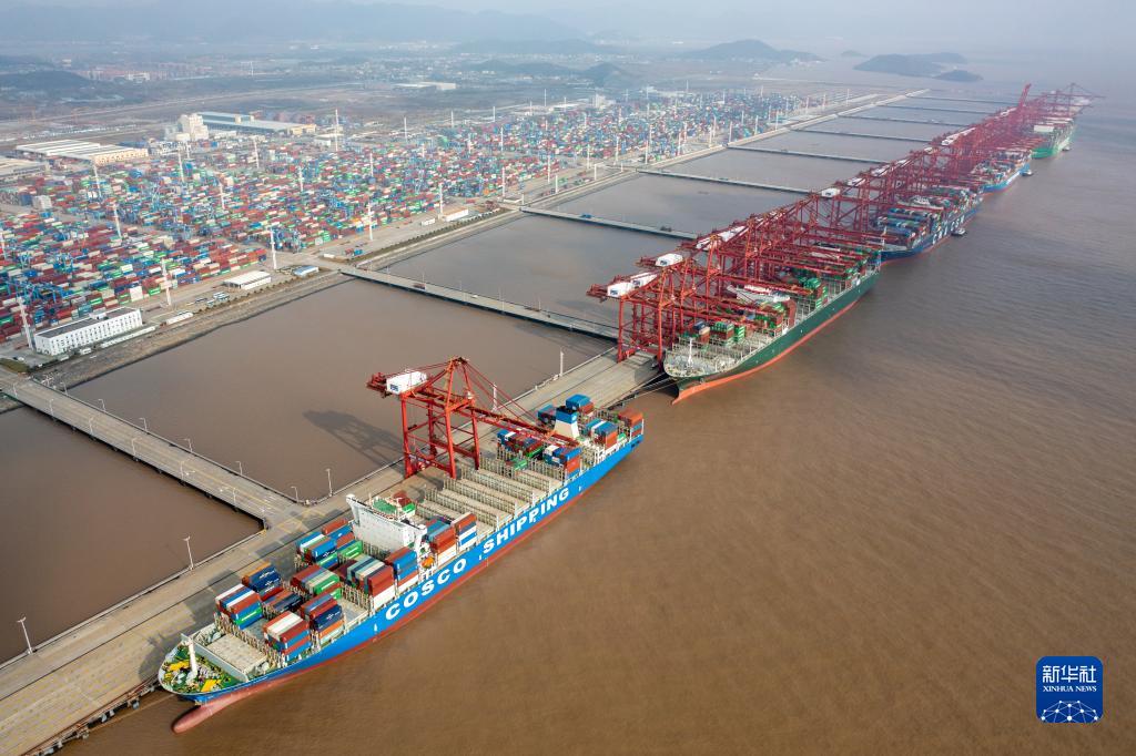 浙江寧波舟山港梅山港區(qū)集裝箱碼頭一派繁忙景象(2021年12月17日攝,無(wú)人機(jī)照片)。新華社發(fā)(蔣曉東 攝)