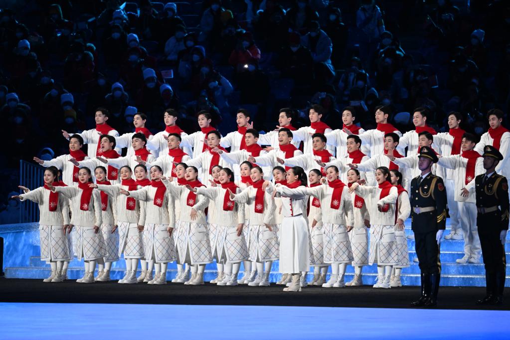 2022年3月4日晚,北京冬殘奧會開幕式上,中國殘疾人藝術(shù)團(tuán)團(tuán)長邰麗華帶領(lǐng)數(shù)十名殘疾人表演者用手語“唱”國歌。