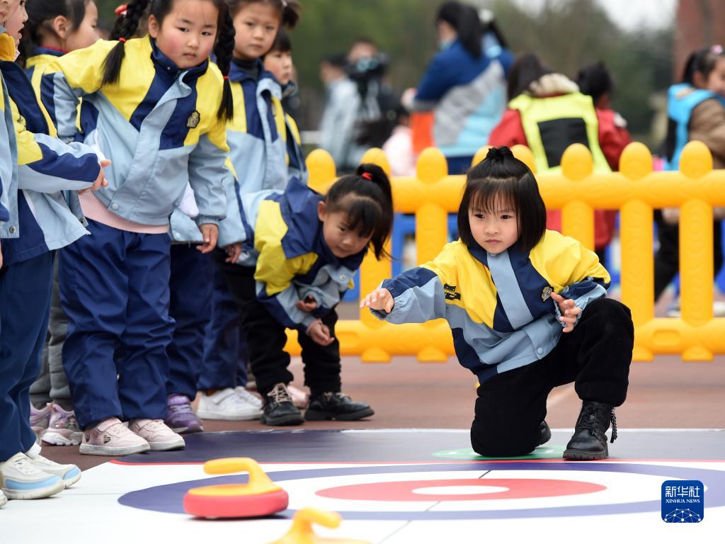 2月16日,安徽省合肥市泰山路幼兒園的小朋友在開學(xué)典禮上體驗“旱地冰壺”游戲。新華社記者 周牧 攝
