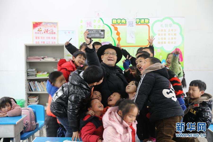 2020年12月17日,植國明在大灣小學(xué)和孩子們自拍。新華社記者 曹力攝