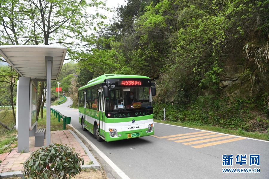 一輛公交車行駛在大灣村的公路上(2020年4月17日攝)。新華社記者劉軍喜攝
