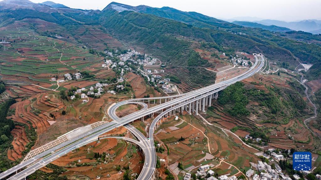 貴州赫(赫章)六(六盤水)高速公路汪家寨互通(4月21日攝,無人機(jī)照片)。新華社記者 陶亮 攝