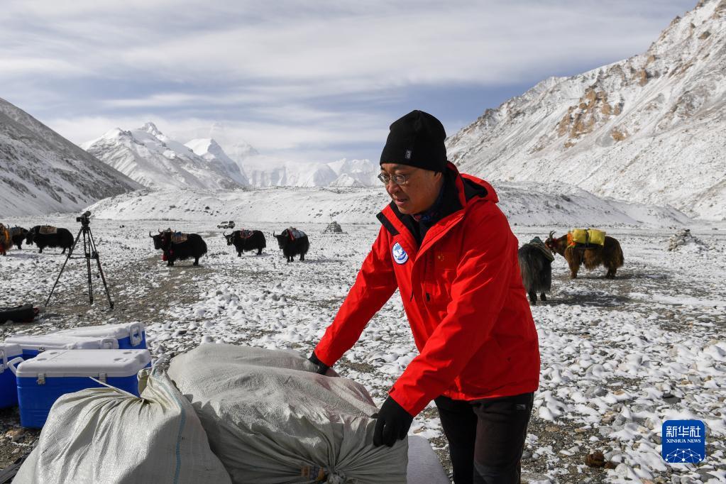 冰川與污染物科考小組負責人康世昌在檢查上山物資(5月1日攝)。新華社記者 姜帆 攝