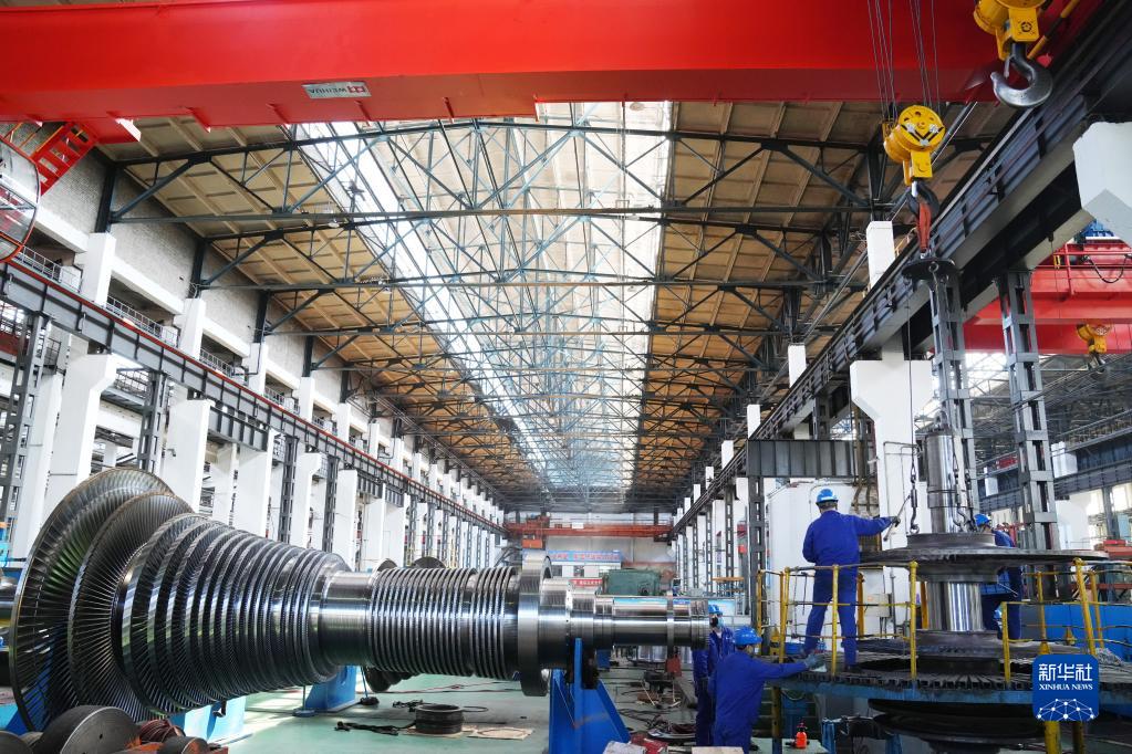 在哈電集團(tuán)哈爾濱汽輪機(jī)廠(chǎng)有限責(zé)任公司生產(chǎn)車(chē)間,工人在生產(chǎn)作業(yè)(5月7日攝)。新華社記者 王建威 攝