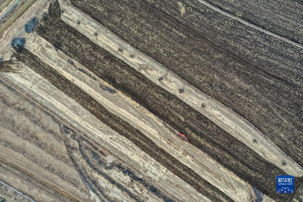 在吉林省吉林市昌邑區(qū)孤店子鎮(zhèn)紅衛(wèi)村,春新生態(tài)家庭農(nóng)場(chǎng)農(nóng)民駕駛農(nóng)機(jī)耕地(4月26日攝,無(wú)人機(jī)照片)。新華社記者 張楠 攝