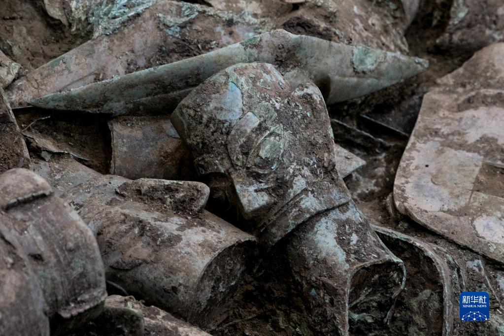這是在三星堆遺址8號(hào)“祭祀坑”拍攝的銅人像(6月1日攝)。新華社記者 王曦 攝