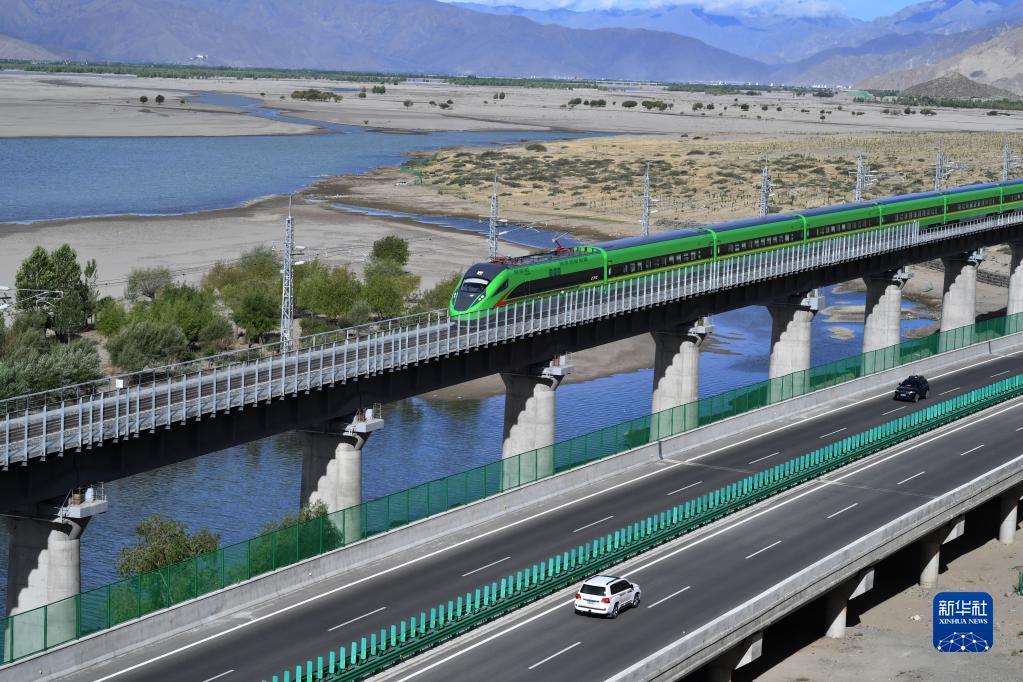 試運(yùn)行的復(fù)興號(hào)列車行駛在雅魯藏布江畔(2021年6月16日攝)。新華社記者 覺果 攝