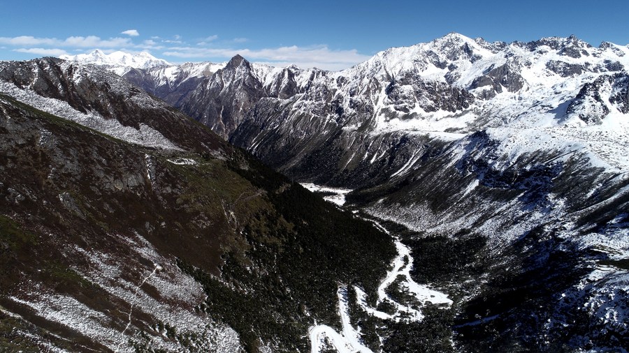 通往西藏洛扎縣拉郊鄉(xiāng)杰羅布村的道路(1月17日攝,無人機照片)。新華社記者 韓曦樂 攝