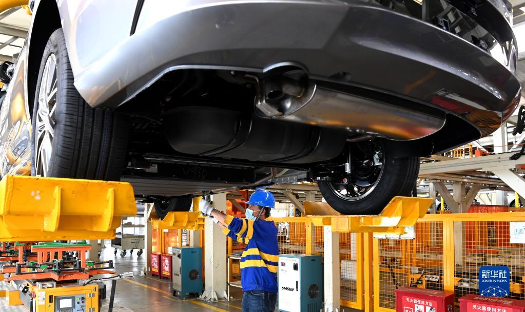 工作人員在西安比亞迪草堂工業(yè)園汽車總裝廠進行新能源汽車裝配(2022年4月20日攝)。新華社記者 劉瀟 攝