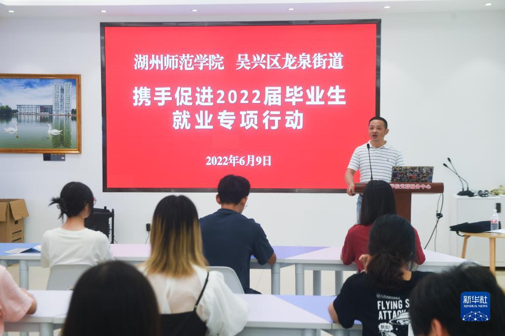 浙江省湖州市吳興區(qū)龍泉街道工作人員應(yīng)邀為湖州師范學(xué)院2022屆畢業(yè)生詳細(xì)介紹就業(yè)創(chuàng)業(yè)的相關(guān)政策,為畢業(yè)生答疑解惑(2022年6月9日攝)。新華社記者 徐昱 攝