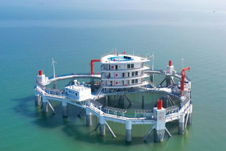 ↑“耕海1號”海洋牧場綜合體平臺位于山東省煙臺市漁人碼頭以東海域,是我國首座大型智能化海洋牧場綜合體平臺,于2020年7月投運,每年可養(yǎng)殖優(yōu)質海水魚類20萬尾,年產量約15萬公斤(2020年7月10日攝)。