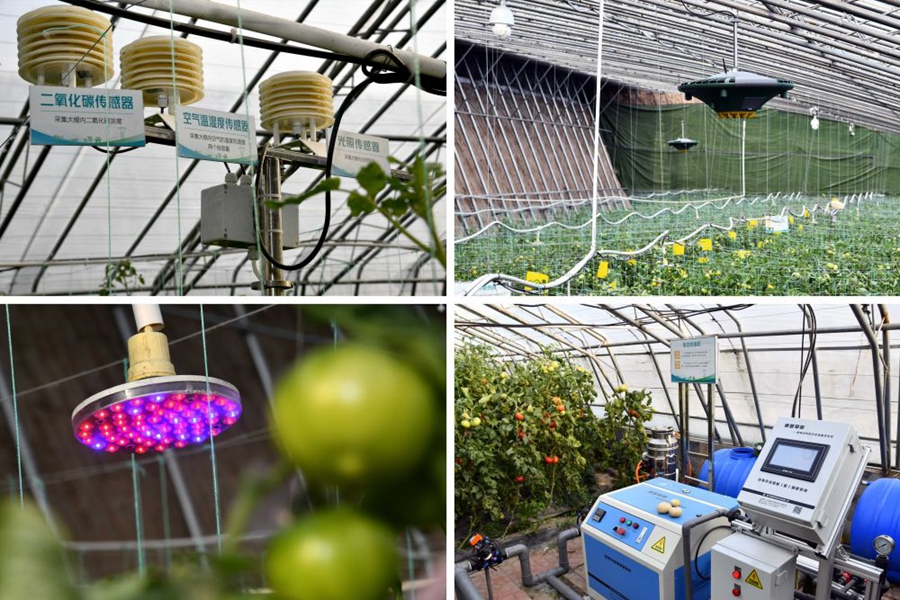↑這是在山東省壽光市現(xiàn)代農業(yè)高新技術試驗示范基地拍攝的AI智慧大棚內景。左上為傳感器設備;右上為多功能植保機;左下為補光燈;右下為電動噴淋機(2020年4月21日攝)。