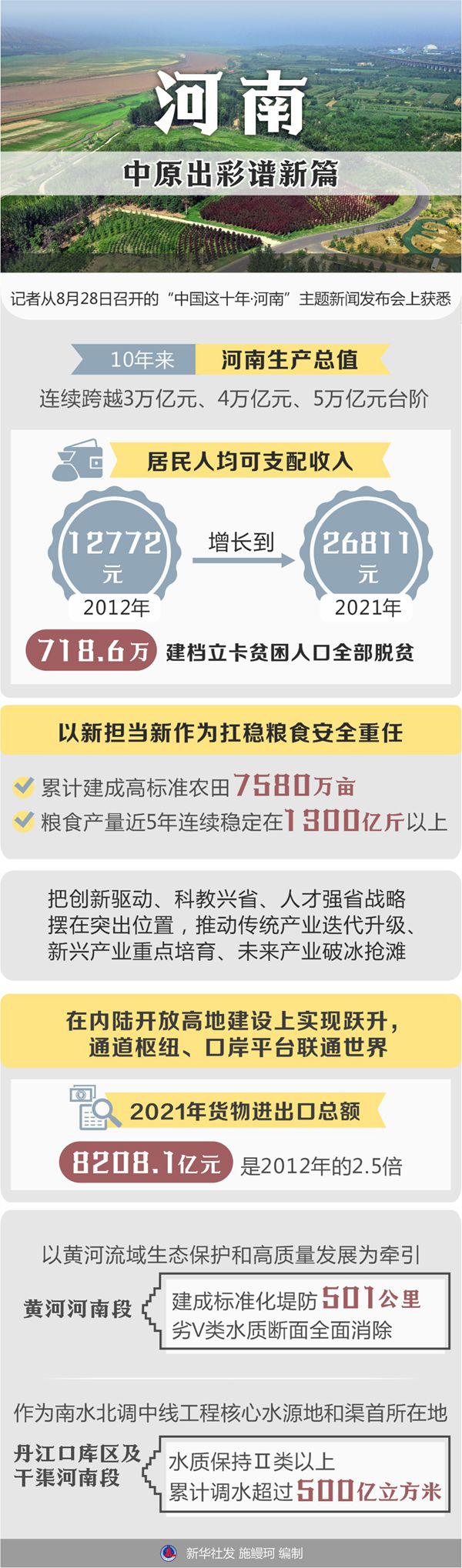 ? 新華社鄭州8月28日電(記者馮大鵬)記者從28日召開的“中國(guó)這十年·河南”主題新聞發(fā)布會(huì)上獲悉,黨的十八大以來(lái),河南深入貫徹落實(shí)習(xí)近平總書記重要指示精神,牢記囑托、開拓進(jìn)取、接續(xù)奮斗,在中部地區(qū)崛起中奮勇爭(zhēng)先,譜寫新時(shí)代中原更加出彩的絢麗篇章。