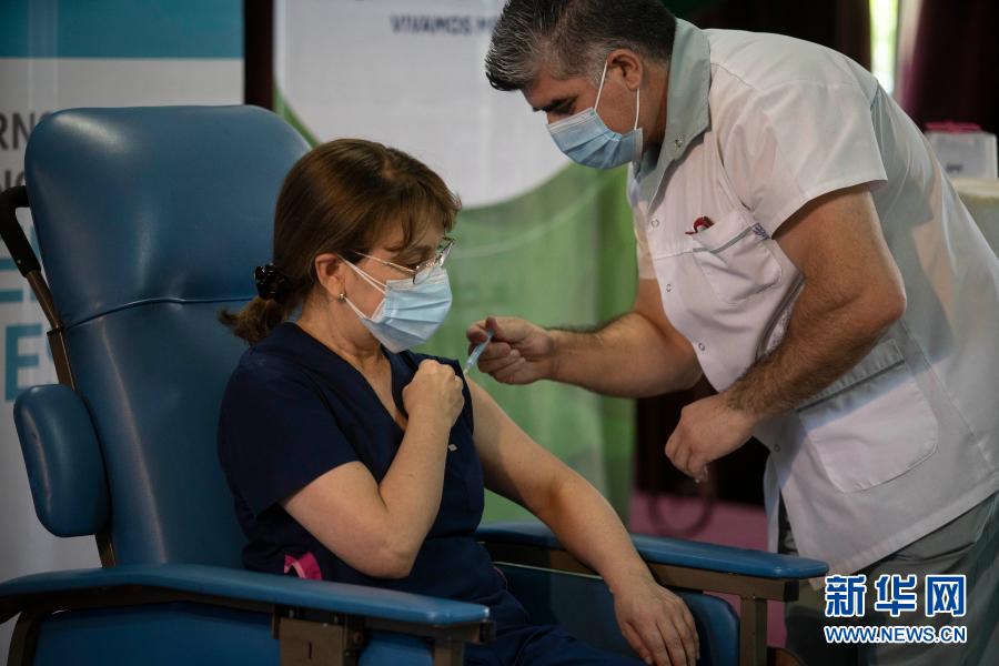 2020年12月29日,在阿根廷布宜諾斯艾利斯省阿維亞內(nèi)達(dá),一名醫(yī)務(wù)人員接種由俄羅斯研發(fā)的“衛(wèi)星V”疫苗。新華社發(fā)(馬丁·薩巴拉攝)