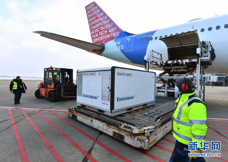 2021年1月16日,在塞爾維亞首都貝爾格萊德,機(jī)場(chǎng)工作人員卸載首批由中國(guó)國(guó)藥集團(tuán)生產(chǎn)的新冠疫苗。新華社發(fā)(普雷德拉格·米洛薩夫列維奇攝)