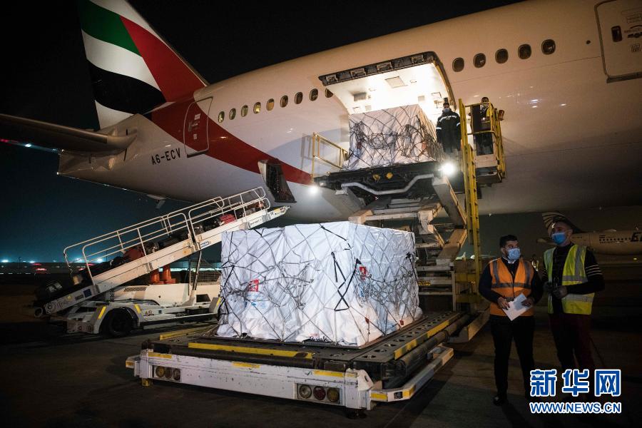 2020年12月10日,在埃及開羅國(guó)際機(jī)場(chǎng),工作人員運(yùn)輸中國(guó)研制生產(chǎn)的新冠疫苗。新華社記者鄔惠我攝
