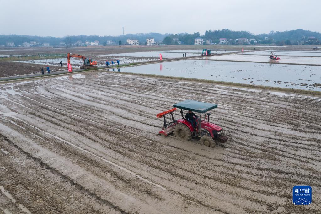 在湖南省常德市桃源縣潯陽街道大平村,工作人員駕駛農(nóng)機平整土地(2022年2月17日攝,無人機照片)。新華社記者 陳思汗 攝