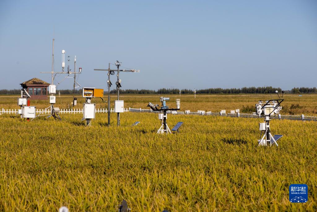 這是黑龍江省富錦市萬畝水稻科技示范園內(nèi)的氣象監(jiān)測設(shè)備(2022年9月2日攝)。新華社記者 張濤 攝